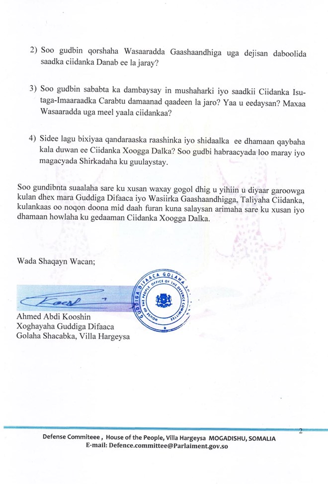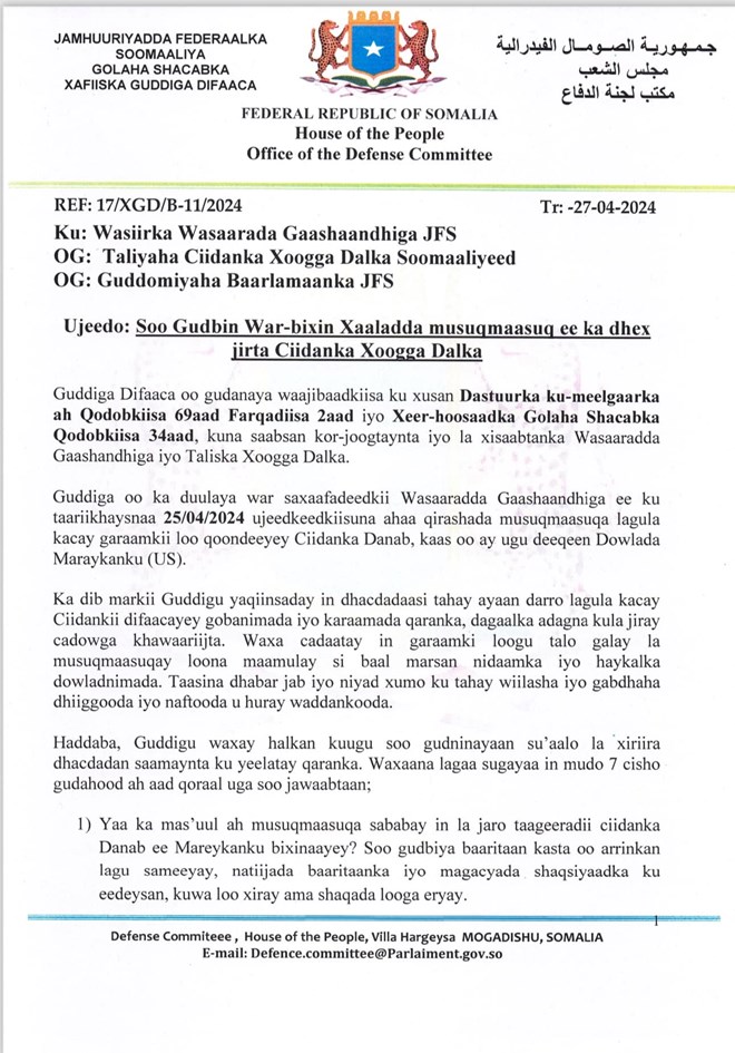 Guddiga difaaca ayaa wasaaradda gaashaandhigga ka sugaya inuu kasoo jawaabi su’aalo ay kamid ah, cidda masuulka ah masuq masuqa raashinka ciidanka Danab.