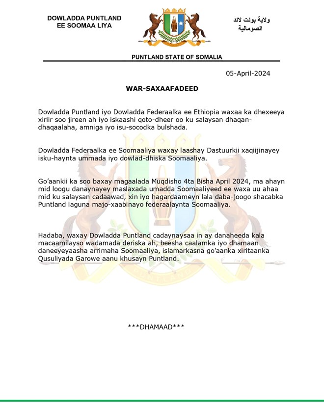 "Dowladda Puntland iyo Dowladda Federaalka Itoobiya waxaa ka dhaxeeya xiriir soo jireen ah iyo iskaashi qoto-dheer, oo ku saleysan dhaqan-dhaqaalaha, amniga iyo isu socodka bulshada. Go’aankii ka soo baxay Magaalada Muqdisho 4-ta bisha April 2024, ma ahayn mid loogu daneynayay maslaxada ummadda Soomaaliyeed ee waxa uu ahaa mid ku saleysan cadaawad, xin iyo hagardaameyn lala daba joogo shacabka Puntland, laguna majo xaabinayo federaleynta Soomaaliya" ayaa lagu yiri Warsaxafadeedka kasoo baxay Madaxtooyada Puntland.