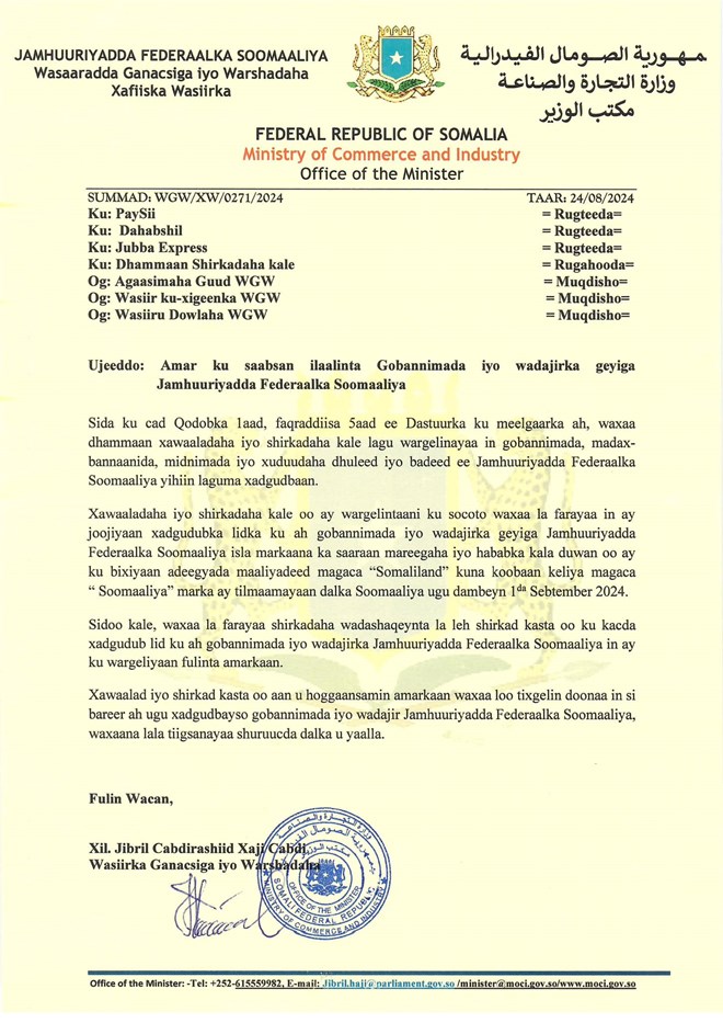 Sabti, Agoosto, 24, 2024 (HOL) - Wasaaradda Ganacsiga iyo Warshadaha Xukuumadda Fedaraalka Soomaaliya ayaa soo saartay amar ku socda Xawaadaha iyo shirkadaha kale ee ganacsiga oo la faray iney ilaaliyaan gobanimada iyo wadajirka Soomaaliya.