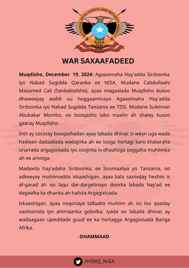 Labada Agaasime ee Sirdoonada Soomaaliya iyo Tanzania ayaa kala saxiixdeen heshiis is afgarad oo ay ku adkeeynayaan muhiimadda iskaashigan oo lagu dar dargelinayo doorka labada hay’ad ee dagaalka ka dhanka ah halista kooxaha loogu yeero argagixisada.