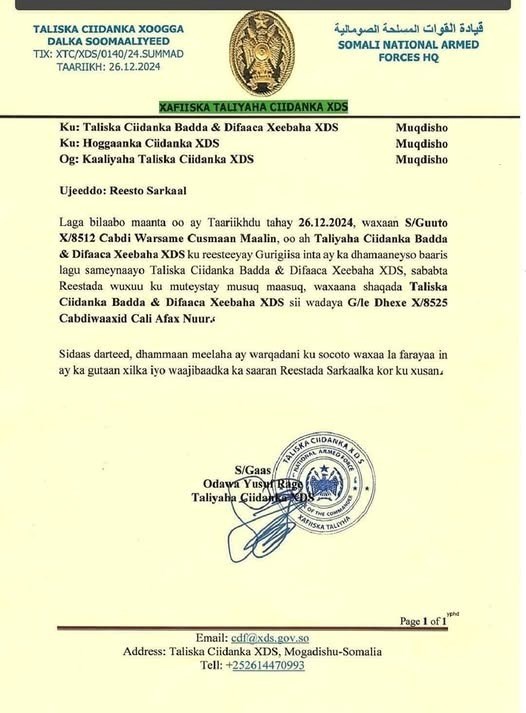 Warqad ujeedadeedu ay ahayd reesto Sarkaal kuna saxiixnaa Taliyaha ciidanka Taliyaha ciidanka xoogga dalka ayaa lagu yiri "Laga bilaabo maanta oo ay Taariikhdu tahay 26.12.2024, waxaan S/Guuto X/8512 Cabdi Warsame Cusmaan Maalin, oo ah Taliyaha Ciidanka Badda & Difaaca Xeebaha XDS ku reesteeyay Gurigiisa inta ay ka dhamaaneyso baaris lagu sameynaayo Taliska Ciidanka Badda & Difaaca Xeebaha XDS, sababta Reestada wuxuu ku muteystay musuq maasuq, waxaana shaqada Taliska Ciidanka Badda & Difaaca Xeebaha XDS sii wadaya G/le Dhexe X/8525 Cabdiwaaxid Cali Afax Nuura".