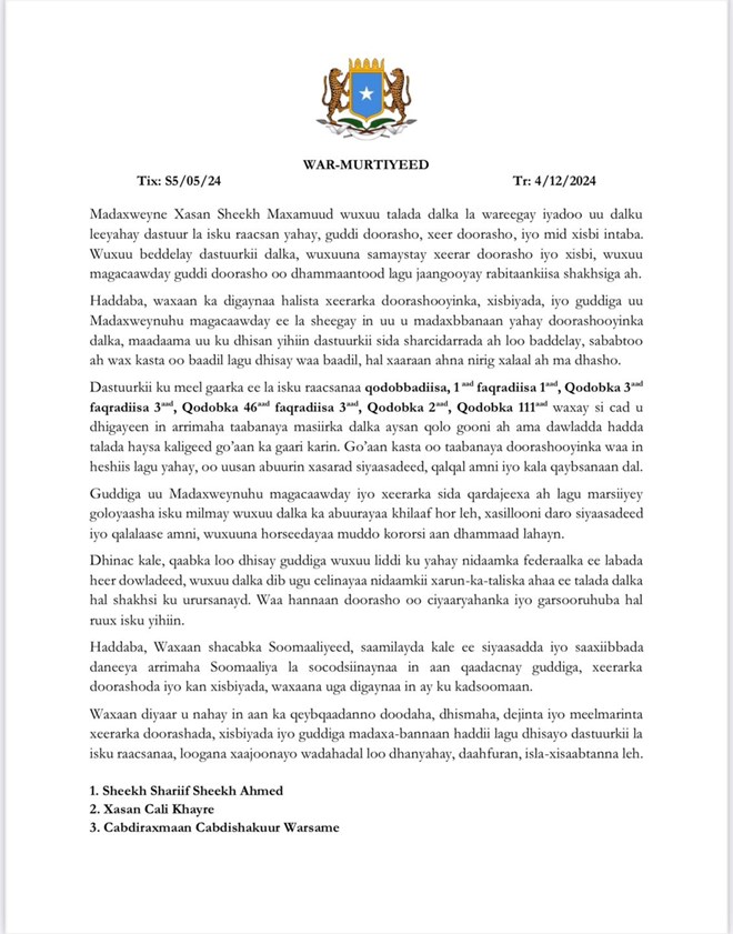 Arbaco, December, 4, 2024 (HOL) - Qaar ka mid ah masuuliyiinta Mucaraadka ee kasoo horjeeda dowladda Fedaraalka Soomaaliya ayaa soo saaray Waraaxafadeed wadajir ah oo ay uga hadlayaan xaalada guud ee dalka iyo arrimaha doorashooyinka.