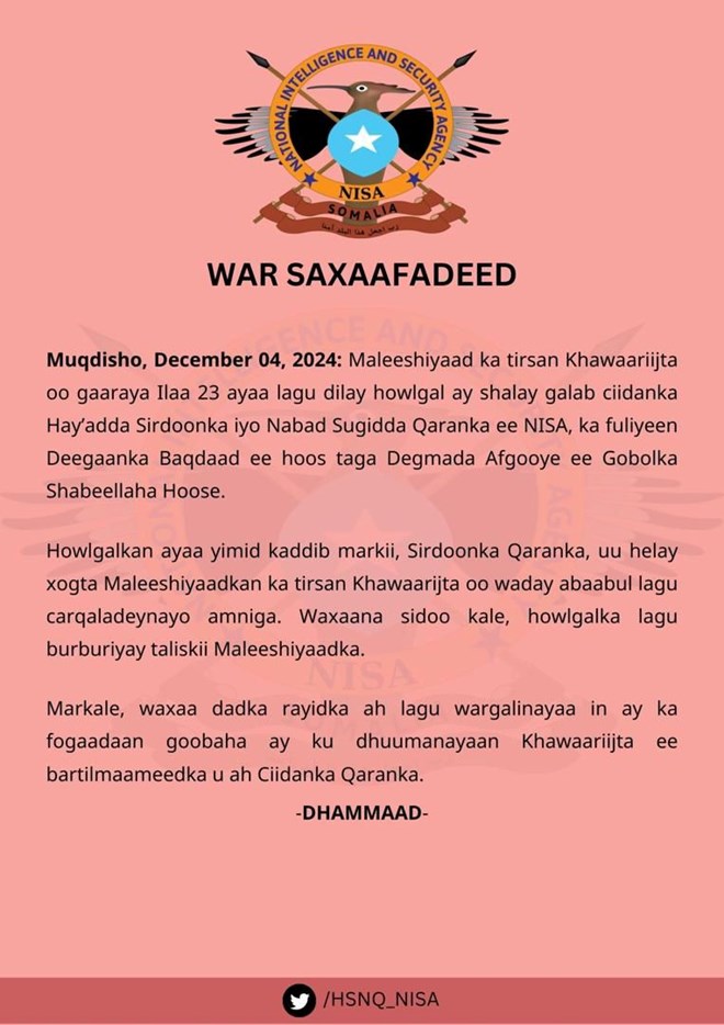 Arbaco, December, 4, 2024 (HOL) - Taliska hay'adda Nabad sugida iyo Sirdoonka Qaranka Soomaaliyeed ee NISA ayaa faahfaahin dheeraad ah ka bixiyay howlgal qorsheysnaa oo lagu dilay xubno ka tirsan kooxda Al-shabaab oo ku sugnaa gobolka Shabeellaha Hoose.