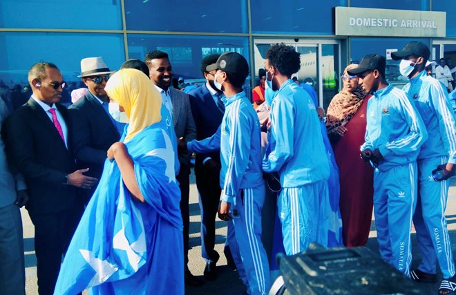 Ugu dambeyntii dhalinyadaan maanta dalka dib loogu soo celiyay ayaa ku labisnaa dharka Calanka Soomaaliya, waxaana wajiyadooda ka muuqatay farxad wayn iyo inay ku qanacsanaayeen kusoo laabashadooda dalkooda.