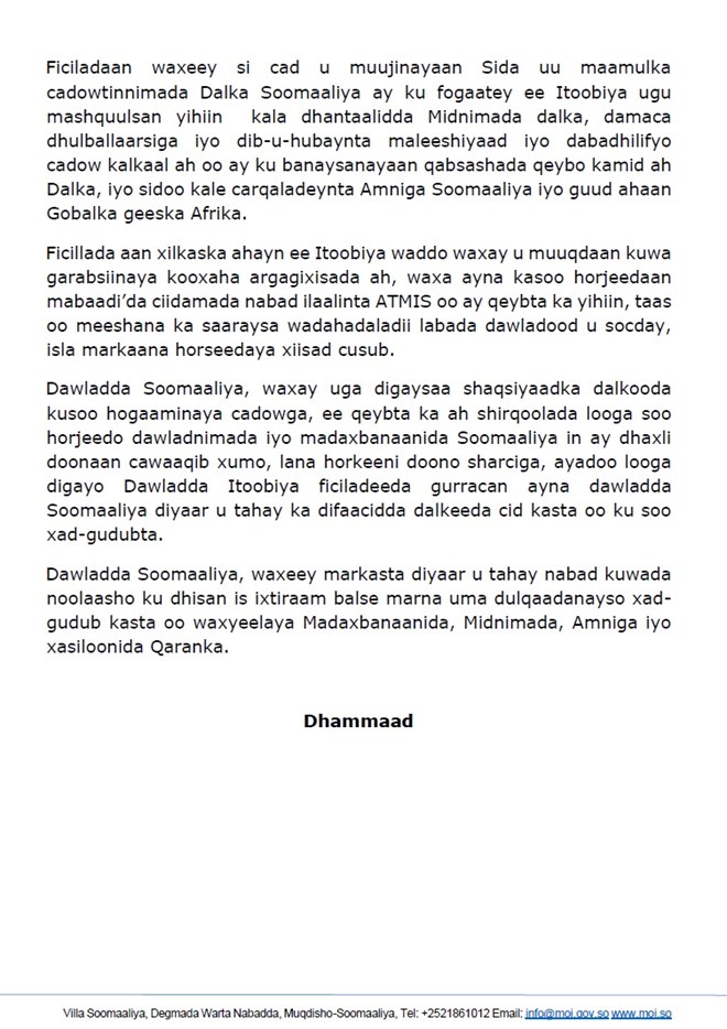 “Sida lala socda Itoobiya waxay Hub si sharci darro ah ugu soo galisay deegaano ka tirsan dowlad goboleedyada Puntland iyo Galmudug, sidoo kale waxaa ay gudaha Itoobiya Ku uruurisay Maleeshiyaad ay ka kaxaysay Hirshabelle, iyadoo u jeedkeedu yahay iney maleeshiyaadkaas ay u adeegsato danaheeda ah dhul balaariga" ayuu yiri Wasiir ku xigeenka Warfaafinta Cabdiraxmaan Alcadaala.