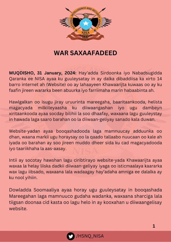 Khamiis, February, 1, 2024 (HOL) - Hay'adda Nabadsugida iyo Sirdoonka Qaranka Soomaaliyeed ee NISA ayaa soo bandhigtay ku dhawaad 20 Website oo ay sheegtay iney ka xirtay kooxda Al-shabaab.