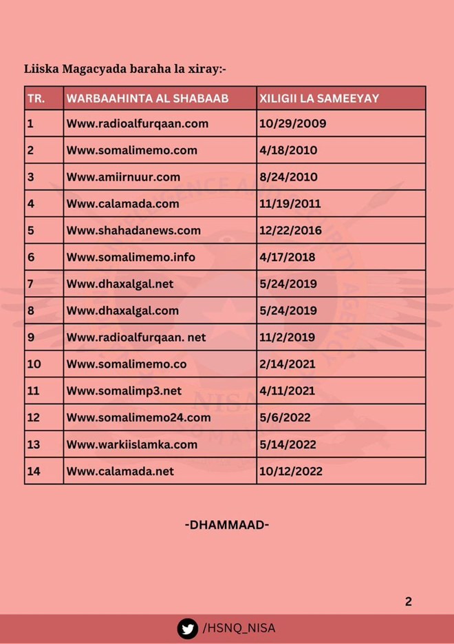 War qoraal ah oo kasoo baxay Hay'adda NISA ayaa lagu sheegay in si rasmi ah hawada looga saaray 14 Website oo laga heli jiray macluumaadka kooxda, islamarkaana laga dhageysan jiray qaarkood Idaacadda ku hadasha afka kooxdaas.