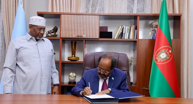 Khamiis, February, 22, 2024 (HOL) - Madaxweynaha dowladda Fedaraalka Soomaaliya Xasan Sheekh Maxamuud ayaa maanta saxiixay heshiiska iskaashiga difaaca iyo dhaqaalaha ay wada galeen dowladaha Soomaaliya iyo Turkiga.