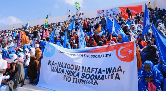 Dadweynaha ka qeyb galay banaanbaxa ayaa watay boorar lagu xardhay ereyo lagu taageerayo heshiiska Soomaaliya iyo Turkiga, waxaana erayada ka mid ahaa ka naxoo nafta waay.