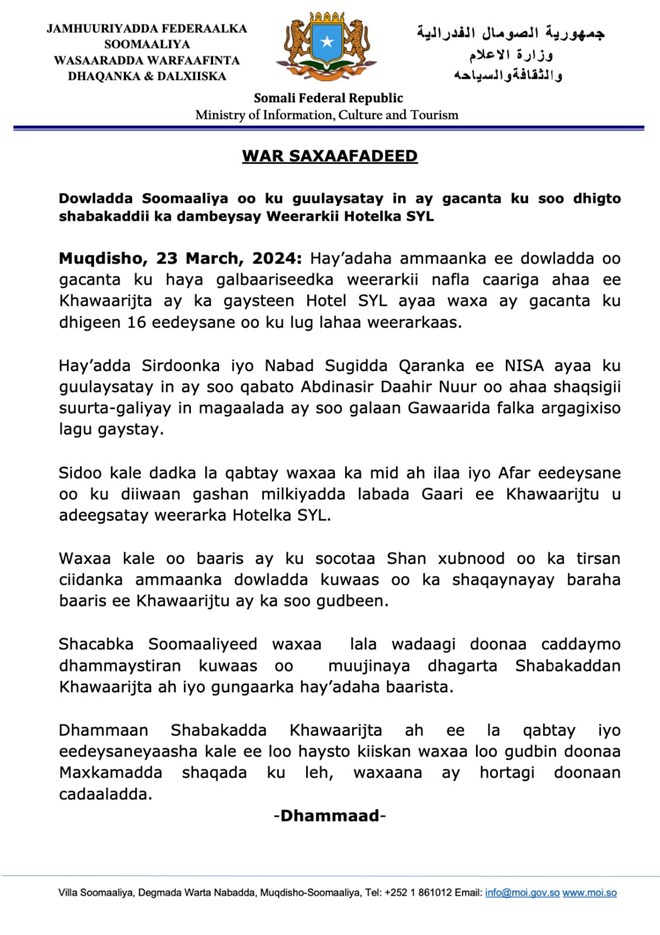Axad, Maarso, 24, 2024 (HOL) - Dowladda Soomaaliya ayaa sheegtay inay sharciga horkeenayso shabakaddii ka dambeysay abaabulka weerarkii dhawaan lagu qaaday hotel SYL ee magaalada Muqdisho.