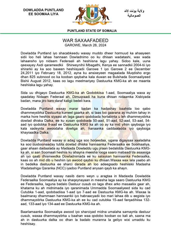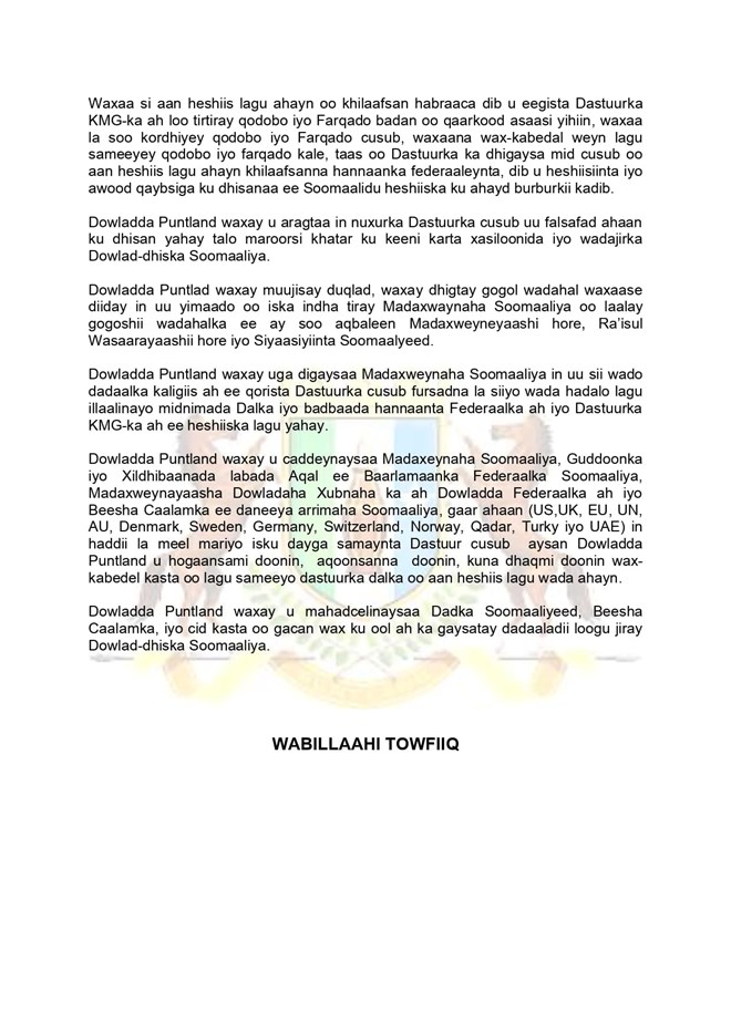“Dowladda Puntland waxay nasiib darro weyn u aragtaa in Madaxda Dowladda Federaalka Soomaaliya ay ka shaqeynayaan in meesha laga saaro Dastuurka KMG ee Federaalka, laguna beddalo Dastuur cusub oo laga dhex arko masaaliix gaar ah, khatarna ku ah midnimada iyo qaranimada Ummadda Soomaaliyeed sida ku cad Cutubka 1-aad, qodobadiisa 1-aad iyo 7-aad ee Dastuurka KMG-ka ah,” ayaa lagu yiri warka kasoo baxay madaxtooyada Puntland.