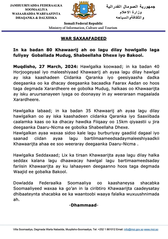 Arbaco, Maarso, 27, 2024 (HOL) - Dowladda Soomaaliya ayaa sheegtay in ka badan 80 Shabaab ah in lagu dilay howlgallo laga fuliyay Goballada Mudug, Shabeellaha Dhexe iyo Bakool.