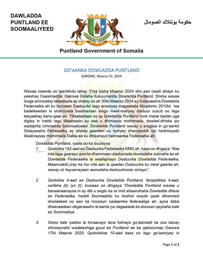 Axad, Maarso, 31, 2024 (HOL) - Puntland ayaa ku dhawaaqday inay kalsoonidii iyo aqoonsigii kala noqotay hay’adaha dowladda federaalka ee Soomaaliya , sida lagu sheegay go’aan kasoo baxay golaha wasiirrada ee Puntland