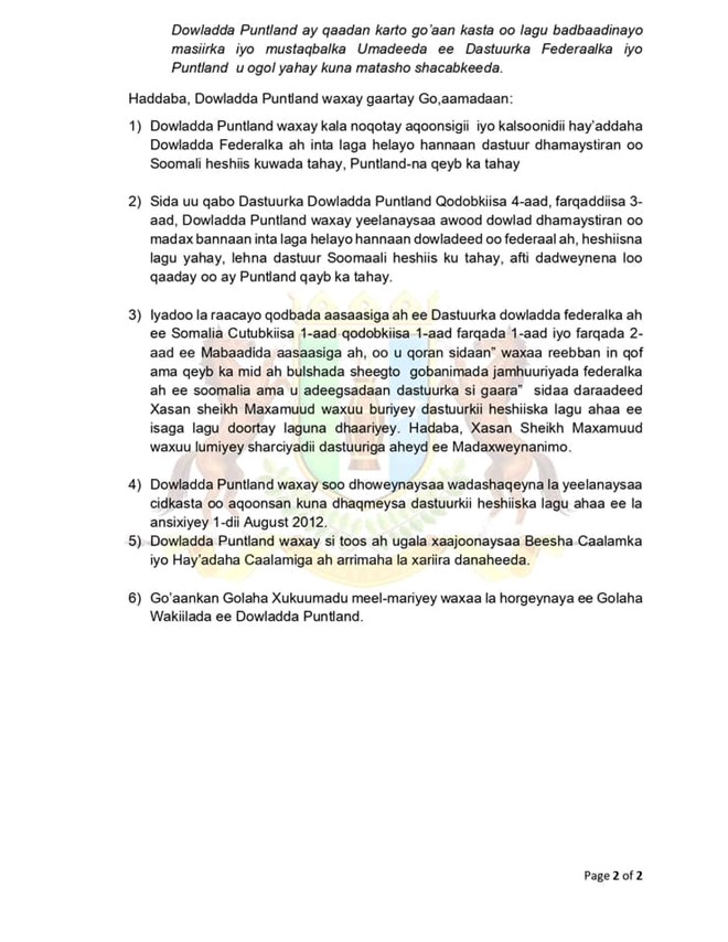 Waxay sheegtay Puntland in madaxweyne Xasan Sheikh uu lumiyay sharciyaddii dastuuriga ahayd ee madaxweynimo, iyadoo sheegtay inuu buriyay nidaamkii Soomaali heshiiska ku ahayd.