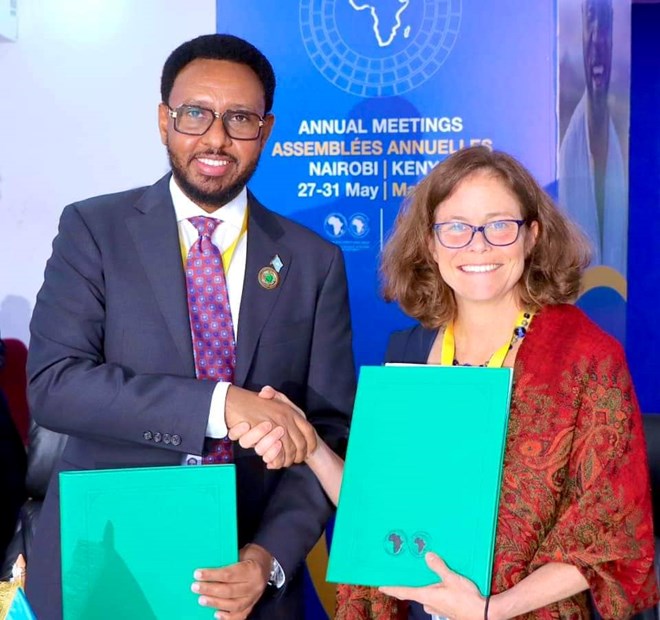 newsinsideMunaasabadda lagu saxiixayay heshiiska Bangiga horumarinta Afrika iyo dowladda Soomaaliya ayaa ka dhacay magaalada Nairobi ee Caasimadda dalka Kenya oo uu ka socdo shirka sanadlaha ee Bangiga Horumarinta Afrika.