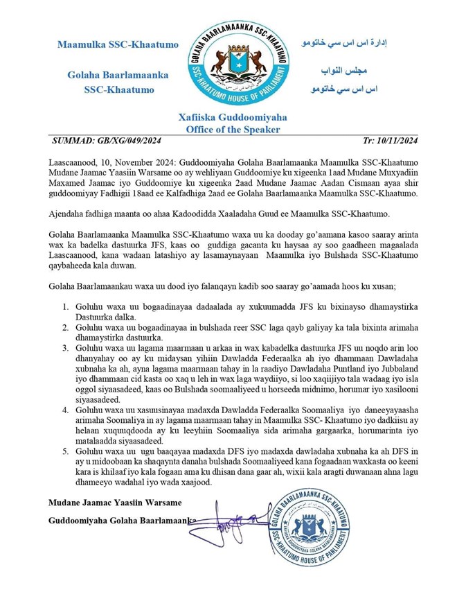 Isniin, November, 11, 2024 (HOL) - Golaha Wakiillada SSC- Khaaatumo ayaa ugu baaqay dowladda Federaalka Soomaaliya in wax ka beddelka dastuurka uu noqdo mid loo wada dhan yahay, oo ay ku lug leeyihiin dowladda Federaalka iyo dhammaan dowladaha xubnaha ka ah.
