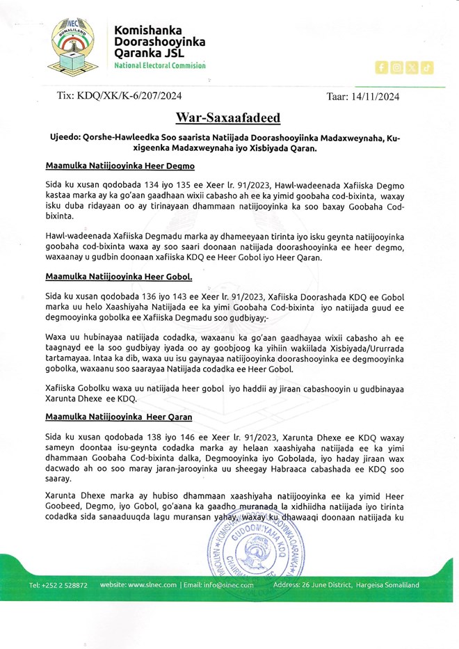 Khamiis, October, 14, 2024 (HOL) - Koomiishanka Doorashooyinka Somaliland, ayaa sheegay in marka hore lasoo saari doono natiijooyinka degmooyinka iyo gobolada, kadibna lagu dhawaaqi natiijada guud.