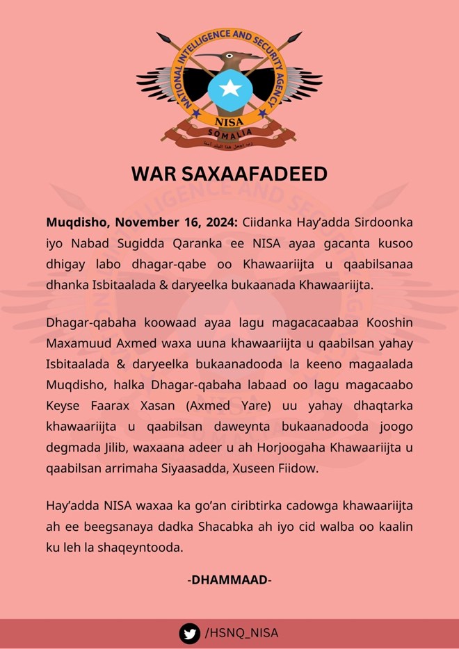 “Hay’adda NISA waxa ka go’an ciribtirka cadowga khawaarijta ah ee beegsanaya Shacabka soomaaliyeed iyo cid walba oo kaalin ku leh la shaqayntooda” ayaa lagu yiri qoraalka.