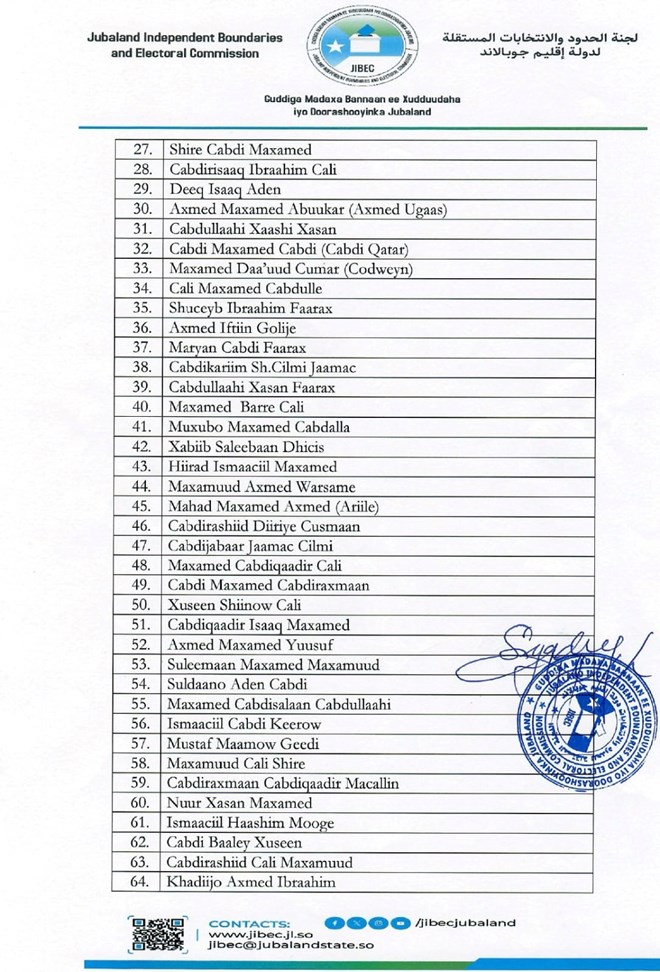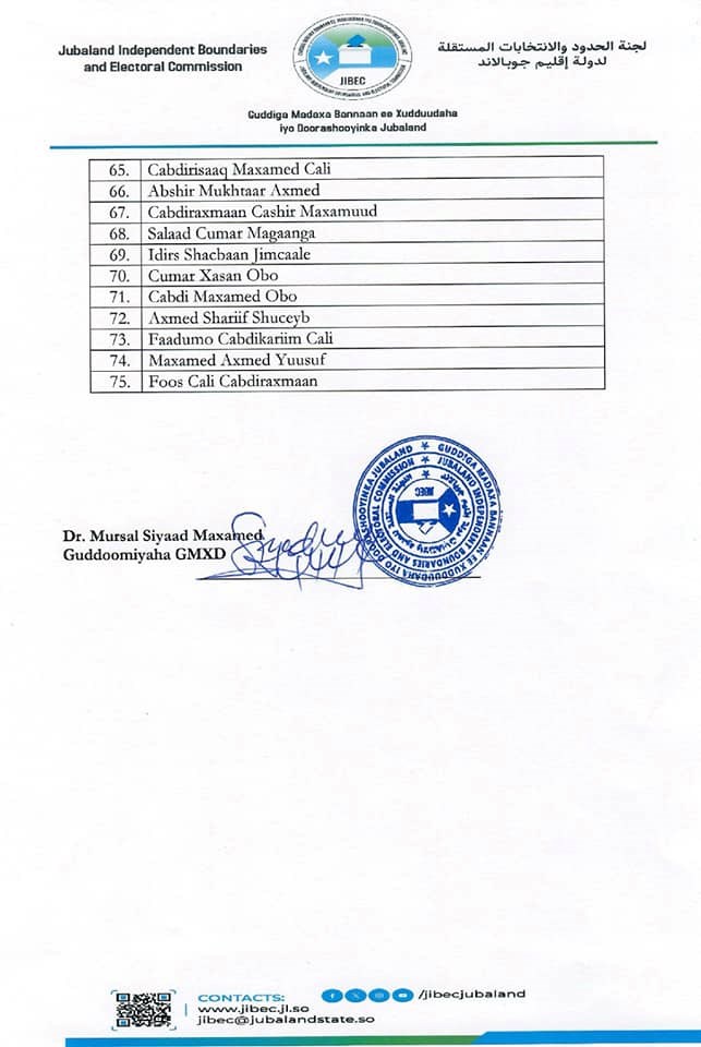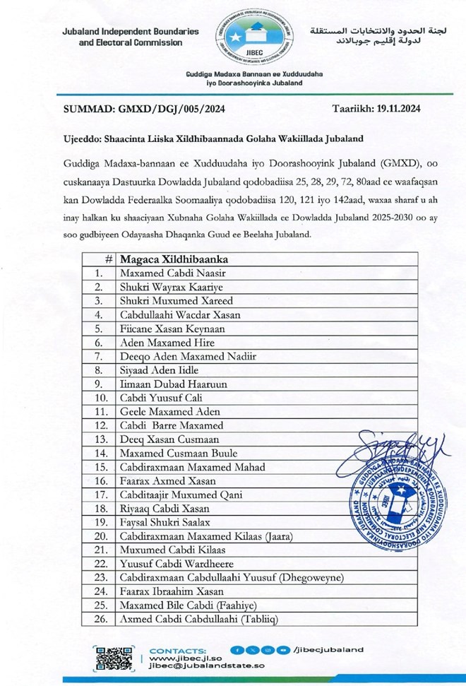 Talaado, October, 19, 2024 (HOL) - Guddiga doorashada jubbaland ayaa shaaciyay liiska xildhibaanada baarlamaanka Jubbaland oo ka kooban 75 xubnood, iyagoo isla galabta lagu dhaariyay magaalada Kismaayo.