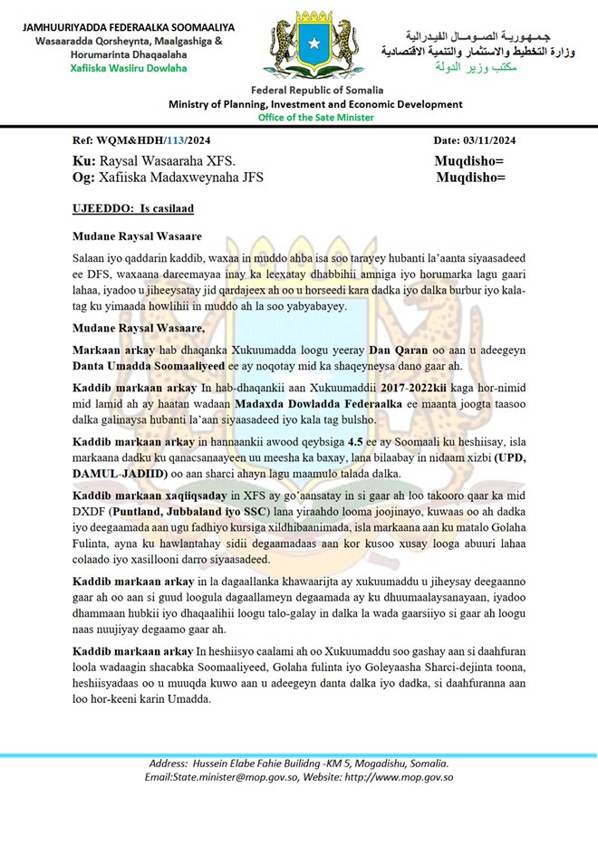 Hoos ka akhriso Warqada is casilaada Wasiiru dowlahii Wasaaradda Qorsheynta:-