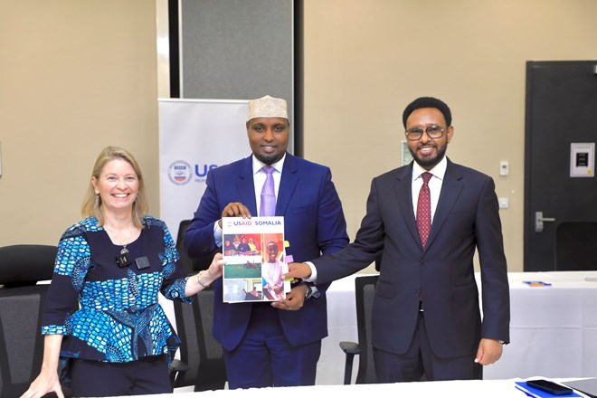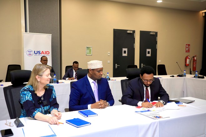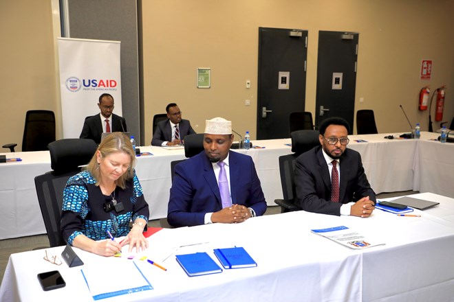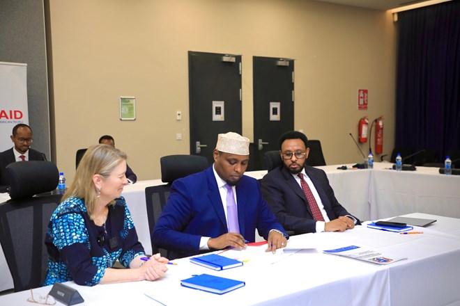 newsinsideHeshiiskan ayaa waxaa Muqdisho u saxiixay Wasiirka Qorsheynta, Maalgashiga, iyo Horumarinta Dhaqaalaha Soomaaliya, Maxamuud Cabdiraxmaan Sheekh Faarax (Beene-Beene), Wasiirka Maaliyadda, Biixi Iimaan Cige, iyo Madaxa USAID ee Soomaaliya, Ms. Catie Lott.