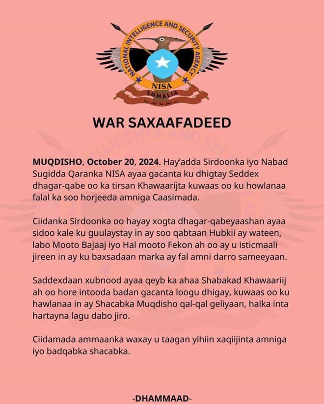 Hoos ka akhriso Warsaxafadeedka kasoo baxay Hay'adda NISA:-
