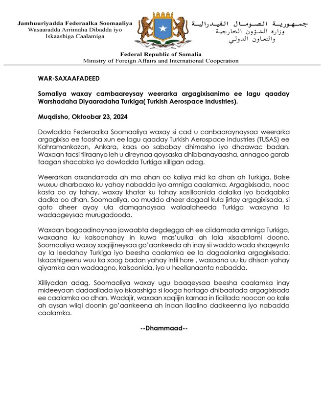 Khamiis, October, 24, 2024 (HOL) - Dowladda Soomaaliya ayaa si kulul u cambaareysay weerarkii shalay lagu qaaday warshadaha hawada sare ee dalka Turkiga (TUSAS) ee magaalada Kahramankazan ee magaalada Ankara, kaasoo geystay khasaare kala duwan.