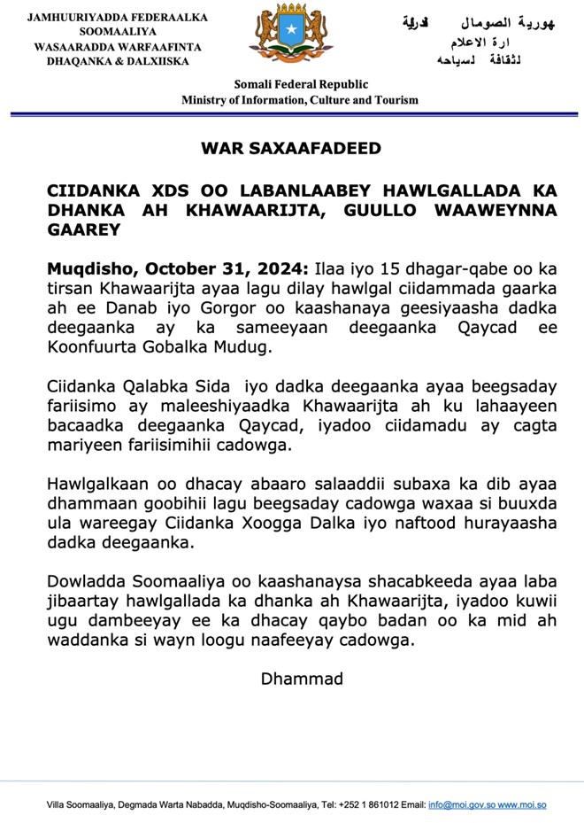 Khamiis, October, 31, 2024 (HOL) - Warsaxafadeed kasoo baxay Wasaaradda Warfaafinta Xukuumadda Fedaraalka Soomaaliya ayaa lagu sheegay in ilaa 15 xubnood oo ka tirsanaa kooxda Al-shabaab lagu dilay howlgalo ciidanka dowladda ka fuliyeen Koonfurta gobolka Mudug.