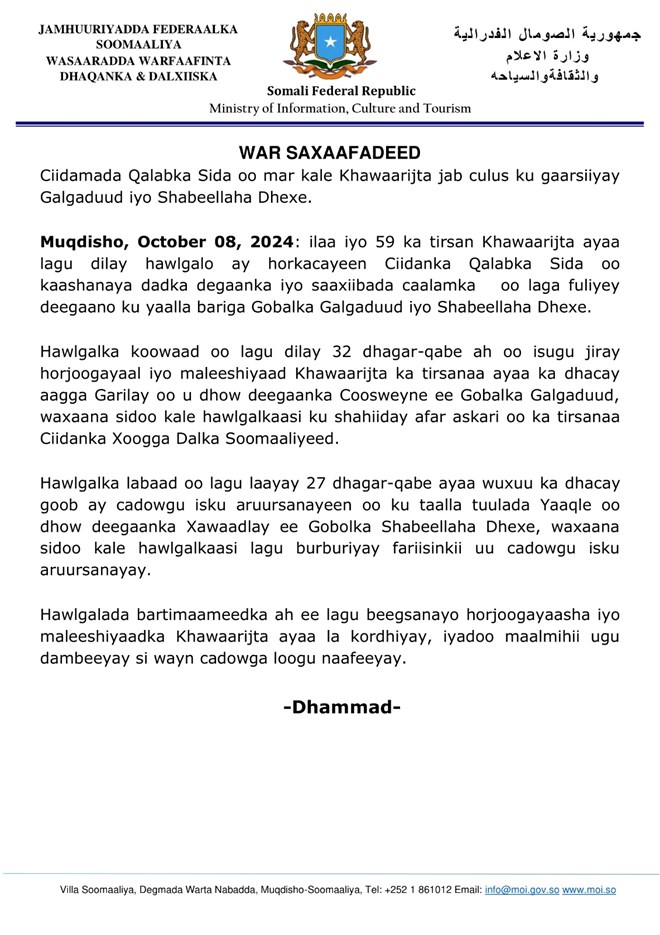 Talaado, October, 8, 2024 (HOL) - Warsaxafadeed kasoo baxay Wasaaradda Warfaafinta Xukuumadda Fedaraalka Soomaaliya ayaa faahfaahino dheeraad ah looga bixiyay khasaaraha ka dhashay howlgalo ay iska kaashadeen ciidanka dowladda, kuwa dadka degaanka iyo saaxiibada caalamka oo laga fuliyey deegaano ku yaala gobalada Galgaduud iyo Shabeellaha Dhexe.