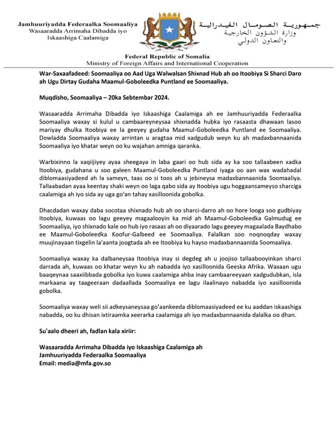 Jimco, September, 20, 2024 (HOL) - Warsaxafadeed kasoo baxay Wasaaradda arrimaha Dibadda iyo Iskaashiga Caalamiga ee Xukuumadda Fedaraalka Soomaaliya ayaa si kulul loogu cambaareyay hub iyo saanad ciidan oo dowladda Itoobiya ay soo gelisay deegaanada maamulka Puntland.