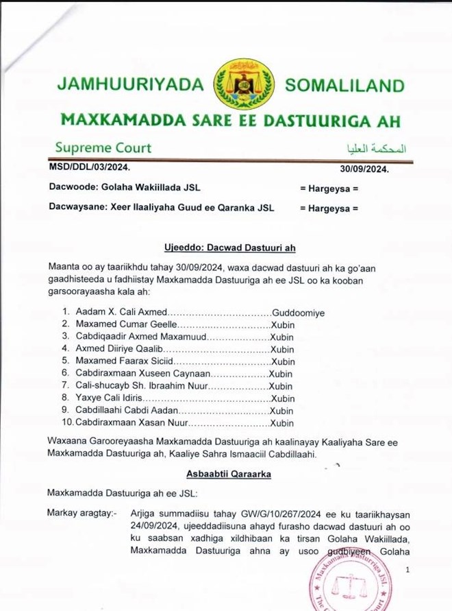newsinsideAmarka maxkamada ayaa soo baxay maanta kadib markii ay ka garnaqday dacwad dastuuri ah, oo ka dhexeysay Golaha Wakiillada iyo Xafiiska Xeer-ilaalinta Somaliland, taasi oo nuxurkeedu ku qotomay xadhiga xildhibaan Abiib.