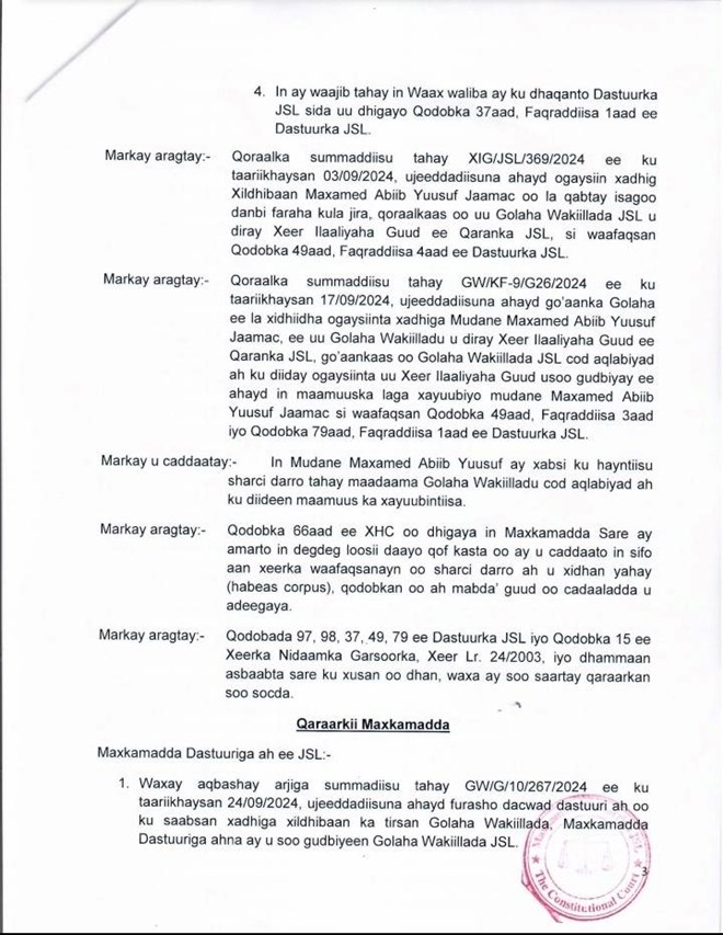 "Waxa la farayaa dhammaan hay’adaha kala duwan ee qaranka JSL in ay dastuurka dalka u hogaansamaan oo ixtiraamaan" ayay maxkamadu ku tidhi qaraarka.