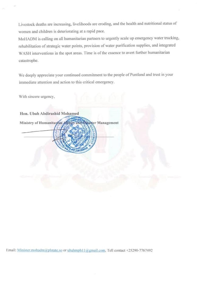 Wasaaradda gargaarka ayaa waxay ugu baaqday hay’adaha samafalka iyo bahwadaagta caalamiga ah in ay si degdeg ah u kordhiyaan taageerada biyo-dhaaminta, dayactirka ceelasha, iyo adeegyada nadaafadda ee muhiimka ah.