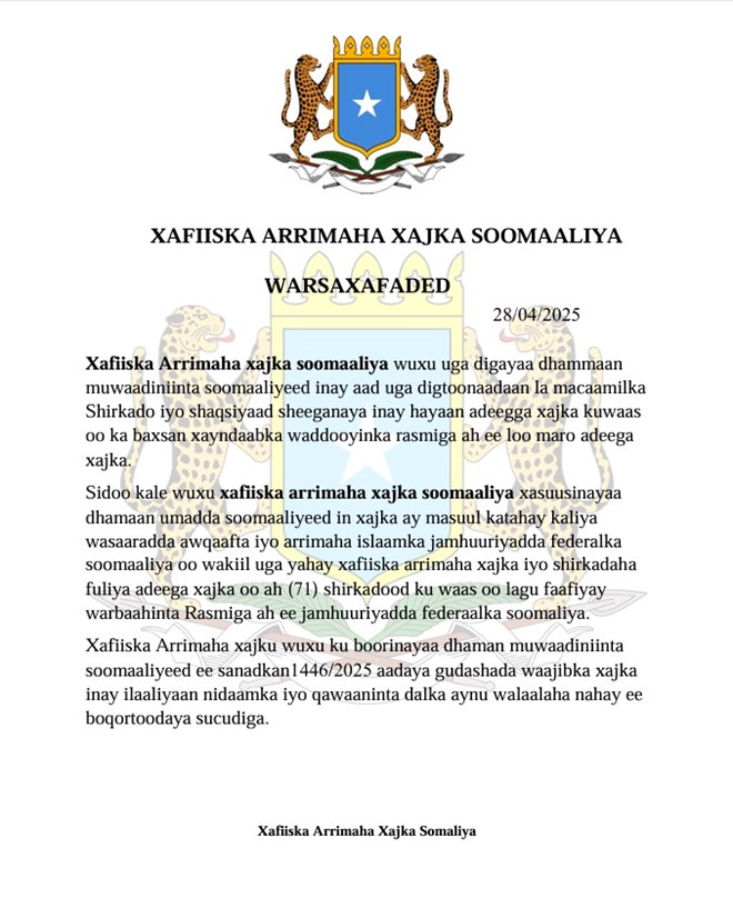 Xafiiskaan ayaa shaaca ka qaaday inay u diiwan gashan yihiin shirkadaha fuliya adeega xajka oo gaaraya (71) shirkadood ku waas oo lagu faafiyay warbaahinta Rasmiga ah ee Jamhuuriyadda Federaalka Soomaliya.