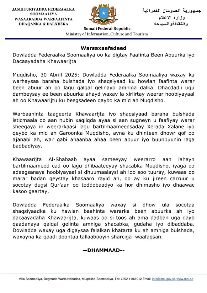 Arbaco, April 30, 2025 (HOL) - Dowladda Soomaaliya ayaa sheegtay in ay ka warhayso baraha bulshada iyo shaqsiyaad ku howlan faafinta warar been abuur ah oo lagu qalqal gelinayo amniga Soomaaliya gaar ahaan marka ay timaado madaafiicda lagu soo garaaco Muqdisho.
