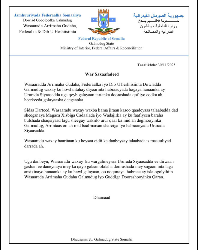 Isniin, December 1, 2025 (HOL) - Maamulka Galmudug ayaa si adag uga horyimid shaqsiyaad degmooyinka maamulkaasi uu u magacaabay Xisbiga Cadaaladda iyo Wadajirka ee uu hoggaamiyo Madaxweyne Xasan Sheekh.
