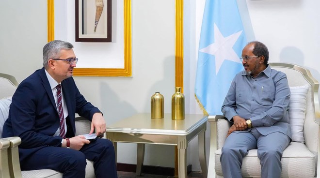 Talaado, February 11, 2025 (HOL) - Madaxweynaha Soomaaliya Xasan Sheekh Maxamuud ayaa Aqalka Villa Soomaaliya ku qaabilay kuxigeenka wasiirka arrimaha dibadda dalka Turkiga Prof. Burhanettin Duran, waxaana ay kawada hadleen dardargelinta heshiiskii Ankara ay kuwada saxiixdeen Dowladaha Soomaaliya iyo Itoobiya.