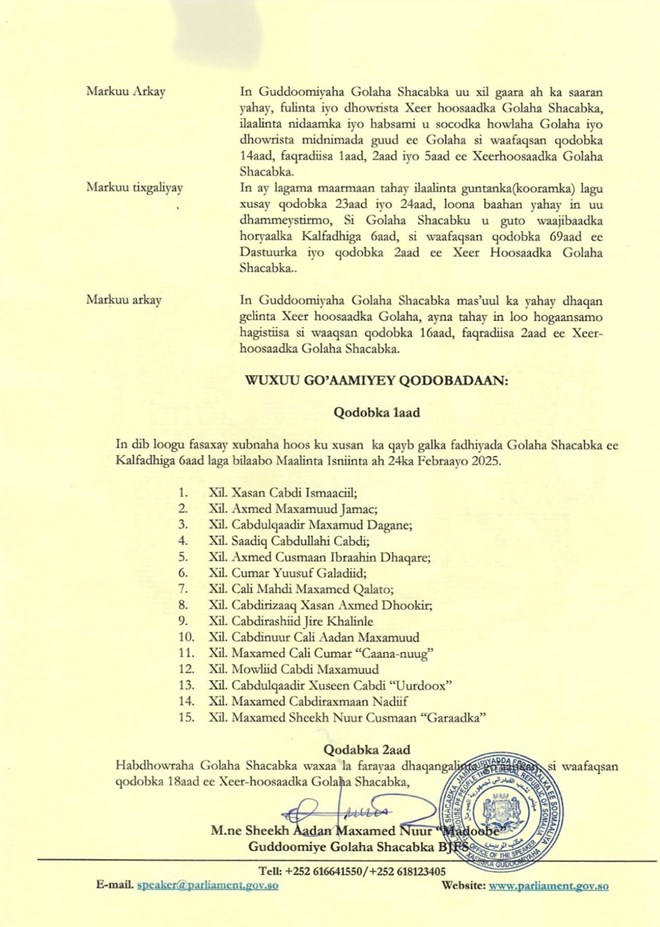 Axad, February 23, 2025 (HOL) - Guddoomiyaha Golaha Shacabka ee Baarlamaanka Jamhuuriyadda Federaalka Soomaaliya, Sheekh Aadan Maxamed Nuur (Madoobe), ayaa dib ugu fasaxay 15 xildhibaan oo ka tirsan Golaha Shacabka ka qeyb galka fadhiyada guud ee Golaha kalfadhiga lixaad.