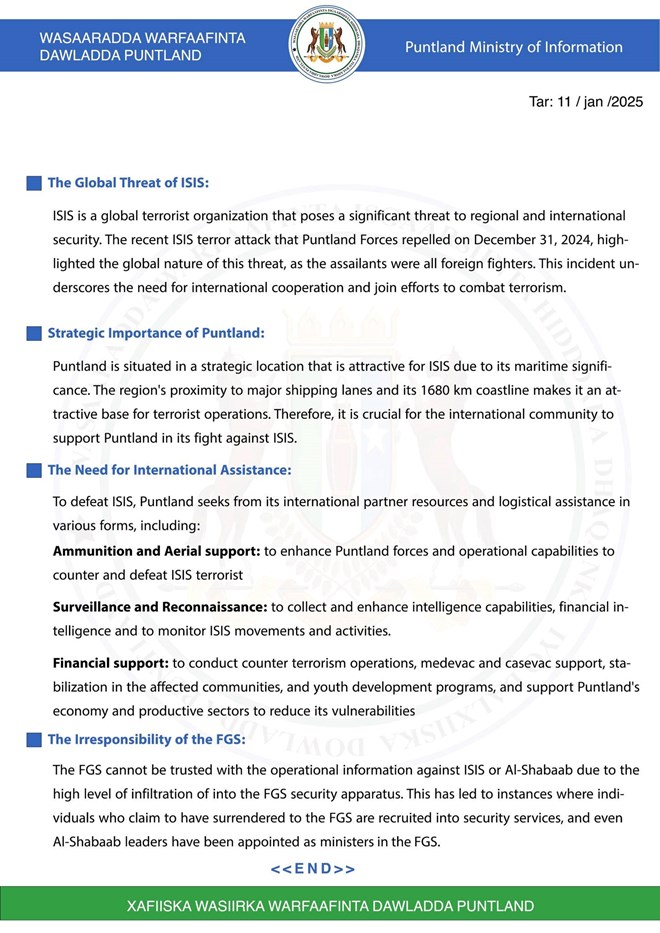 Sabti, January 11, 2025 (HOL) - Puntland ayaa si rasmi ah uga codsatay saaxiibada caalamiga ah ee Soomaaliya in laga caawiyo howlgalka ka dhanka ah kooxda Daacish ee haatan ka socda qeybo kamid ah gobolka Bari.