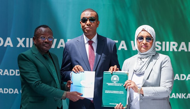 Axad, January 5, 2025 (HOL) - Ra’iisul Wasaaraha Xukuumadda Federaalka Soomaaliya, Xamsa Cabdi Barre, ayaa maanta xilalka u kala wareejiyey Wasiirrada Wasaaradaha Deegaanka iyo Isbeddelka Cimilada iyo Qoyska iyo Horumarinta Xuquuqul Insaanka.