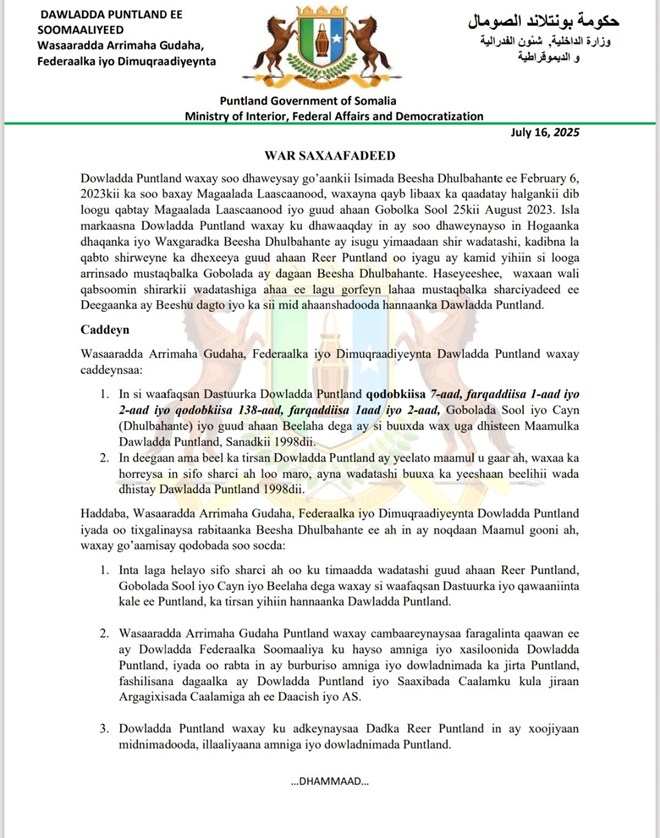 Khamiis, Luulyo 17, 2025 - Puntland ayaa si cad u sheegtay in aysan aqoonsanayn maamulka SSC-Khaatumo, iyadoo sheegtay in aysan jirin sharci ay ku dhisantahay maamul gaar ah oo kasoo baxay deegaanka Beesha Dhulbahante.