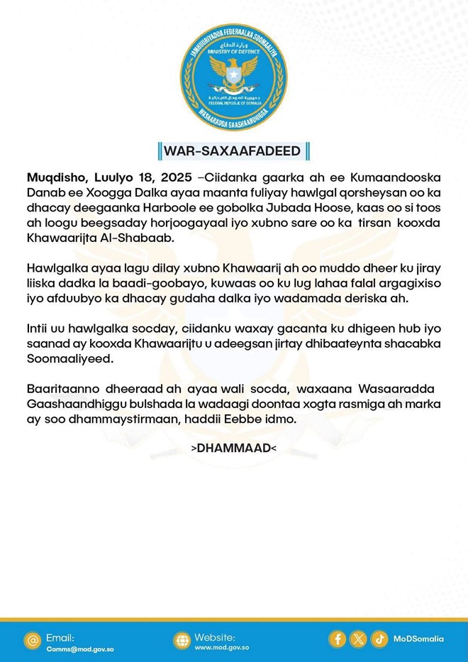 Sabti, Luulyo 19, 2025 (HOL) - Ciidamada xoogga dalka Soomaaliyeed,  gaar ahaan kuwa sida gaarka ah u tababaran ee Kumaandooska Danab ayaa howlgal qorsheysan ka fuliyay deegaanka Harboole ee gobolka Jubbada Hoose.