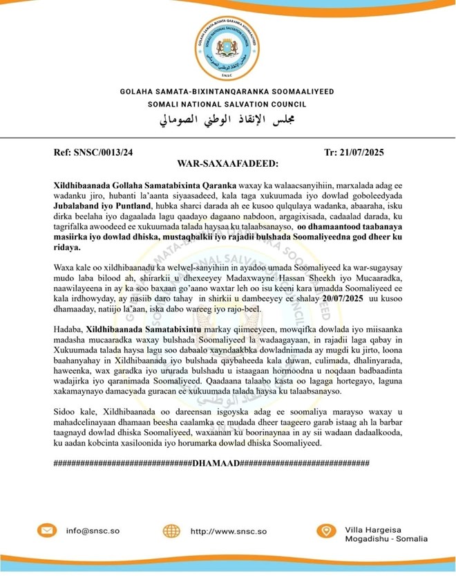 Isniin, Luulyo 21, 2025 (HOL) - Xildhibaanada mucaaradka ee ku mideysan Golaha Samatabixinta Qaranka ayaa maanta warsaxaafadeed ay soo saareen ku muujiyay walaac xoogan oo ay ka qabaan xaaladda guud ee siyaasadda dalka.