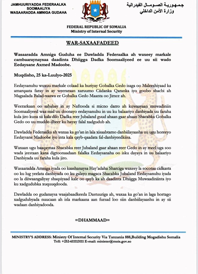 Warsaxaafadeed kasoo baxay Wasaaradda amniga gudaha Soomaaliya ayaa si weyn loogu eedeyay Madaxweynaha Jubbaland Axmed Madoobe inuu amray dagaalka maanta lagu qaaday ciidamada amaanka dowladda Fedaraalka ee ku sugan xerada ciidanka ee loo yaqaano xero UK.