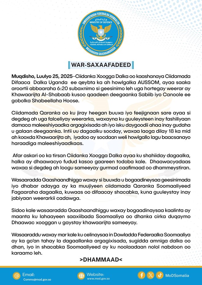 Sabti, Luulyo 26, 2025 (HOL) - Wasaaradda Gaashaandhigga Xukuumada Fedaraalka Soomaaliya ayaa faahfaahin dheeraad ah ka bixisay khasaaraha ka dhashay weerarkii aroornimadii hore ee Shalay kooxda Al-shabaab kusoo qaaday fariisimaha ciidanka xoogga dalka iyo kuwa dalka Uganda ee qeybta ka ah howlgalka AUSSOM ku leeyihiin deegaanka Sabiid iyo Caanoole.