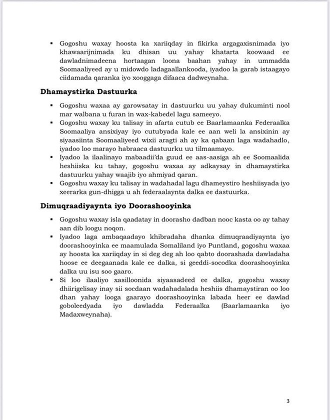 Sidoo kale Gogosha waxa ay isla qaateen in Doorasho dad ban aan dib looga noqon, iyadoo lagu dayanaayo Maamulada Somaliland iyo Puntland, waxaana ay madaxda Gogosha ka qeyb galay ay dhiirigeliyeen inay sii socdaan wada hadalada heshiis dhameystiran oo loo dhan yahay looga gaarayo labada heer ee dowlad goboleedyada iyo mida Baarlamaanka iyo Madaxweynaha.