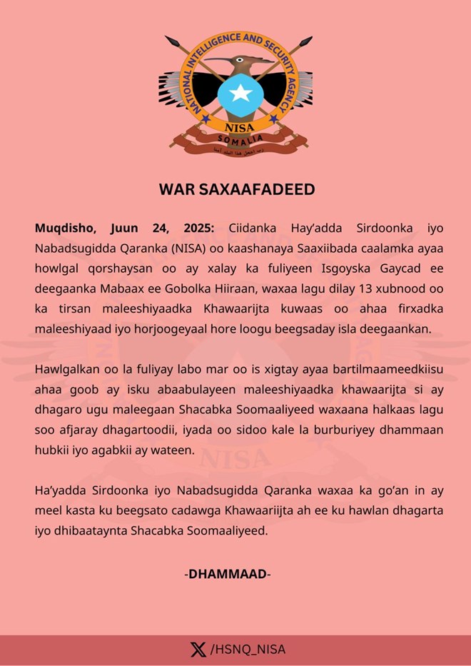 Talaado, Juun 24, 2025 (HOL) - Ciidanka Hay’adda Nabadsugidda iyo Sirdoonka Qaranka Soomaaliyeed ee NISA oo kaashanaya kuwa saaxiibada Caalamka ayaa Xalay howlgal qorshaysan oo lagu dilay xubno ka tirsan Al-shabaab ka fuliyay isgoyska Gaycad ee deegaanka Mabaax ee gobolka Hiiraan.