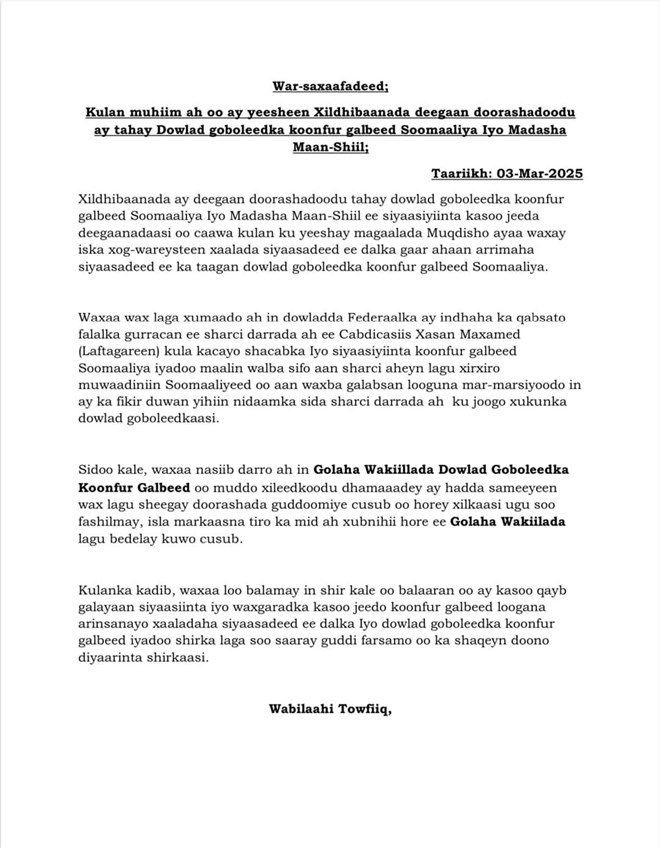 Talaado, Maarso 4, 2025 (HOL) - Qaar Kamid Xildhibaanada labada Aqal ee laga soo doorto deegaanada maamulka Koonfur Galbeed iyo Madasha Maanshiil, siyaasiyiin kasoo jeeda Koonfur Galbeed oo Xalay kulan ku yeeshay magaalada Muqdisho ayaa si adag uga hadlay xaalada siyaasadeed ee ka jirta Koonfur Galbeed.