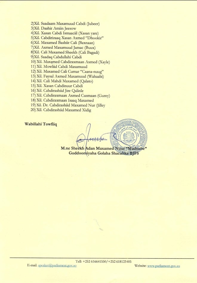 Warqad qoraal ah uusoo saaray Sheekh Aadan Maxamed Nuur ayaa lagu sheegay in sababo amni dartood, 20 kaas mudane aysan soo xaadiri karin fadhiyada ay yeelanayaan xildhibaanada Golaha Shacabka.