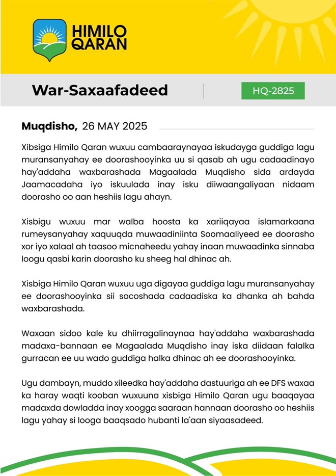 Isniin, May 26, 2025 (HOL) - Xibsiga Himilo Qaran ayaa sheegay inay sikulul u cambaaraynayaan iskuday ay ku sheegeen in guddiga doorashooyinka uu si qasab ah ugu cadaadinayo hay'addaha waxbarashada Magaalada Muqdisho sida ardayda Jaamacadaha iyo iskuulada inay isku diiwaangaliyaan nidaam doorasho oo aan heshiis lagu ahayn.